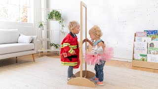 Spark imaginations and creativity with ECR4Kids Bi-Directional Mirror. The versatile mirror is the perfect addition to any playroom or classroom for children to see themselves dressed up in the full-length mirror. The long mirror can be assembled horizontally or vertically to grow with your child. Parents and educators can use horizontally on the floor as a baby mirror paired with a soft mat as a tummy time mirror, encouraging self-awareness, and gross motor skill development. As children grow, flip the orientation for use as a standing mirror for fantasy play or use as a wall mirror for bedroom décor. The 360° design allows multiple children to play at once selecting their own outfits and dressing themselves independently. Constructed from sustainably harvested birch plywood with a durable finish sealing the wood surface and resisting scratching. A UV inhibitor helps furniture resist ultraviolet light and yellowing. Natural birch plywood is extremely durable and will hold up to everyday use in daycares and preschools, great for the home. The child-safe mirror is thoughtfully designed for hands-on learning environments. Slight reflection variation is normal. Pair with other ECR4Kids Birch items to complete any educational space; sold separately.
