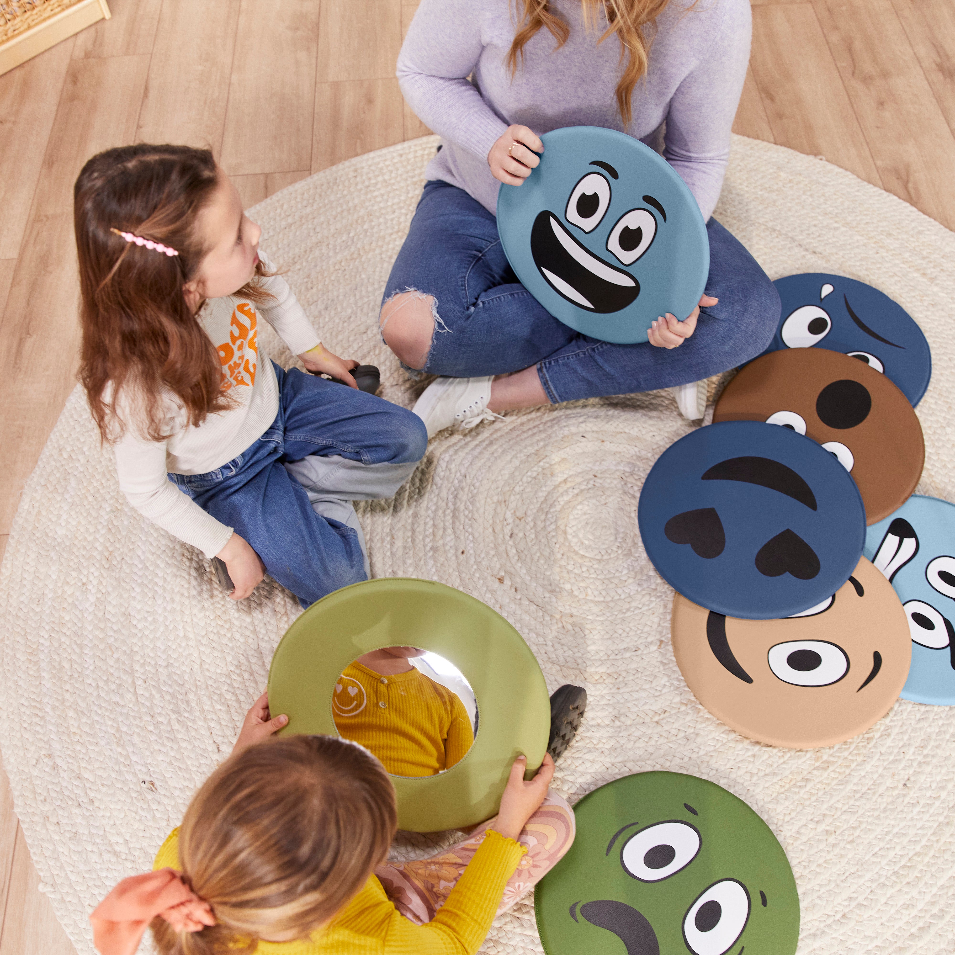 - Durable Materials: Emotion pads are designed for everyday use in an educational environment; foam core is sturdy for experiential collaborative activities with a kid-safe mirror