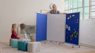 - Classroom Partition: 3-panel room divider as a privacy screen for quiet time or visual aid in a library, school, or gym; double-sided panels with magnetic whiteboard on one side and felt on the other