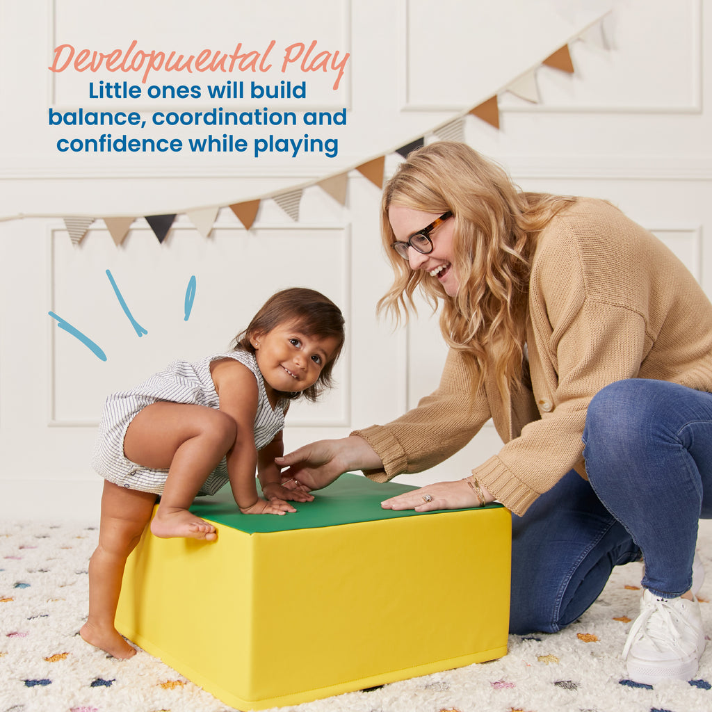 Little climbers will develop important gross motor skills as they move and play on ECR4Kids SoftZone Pedestal. This foam square is great for daycares, apartment homes, and smaller playrooms. With endless possibilities for play, this foam piece promotes and strengthens early muscle movement, enhances physical coordination and balance, and helps overall body control. This soft climbing structure keeps curious babies active and engaged while encouraging little hands and feet to climb and explore the gentle foam climbing square. Little ones can use the pedestal to pull up, climb on top, and safely back down. Place against a wall for a soft spot to read a story or in a corner for additional support. Combine with other foam pieces to build a fun obstacle course; sold separately. As young children explore, they gain self-confidence while improving hand-eye coordination, agility, and core strength. Shape is lightweight and easy to carry allowing parents, teachers, and caregivers to set up. Remove shoes to help preserve the longevity of the product. The square's foam core is encased in water-resistant polyurethane vegan leather with a durable woven backing, complete with a non-slip base for stability. Keep playtime fresh by creating configurations with other ECR4Kids SoftZone pieces.