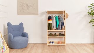 Combine style and function with ECR4Kids TrendiTot Clothing Rack. Ideal for children’s bedrooms, playrooms, and mudrooms, the Montessori-inspired dress-up wardrobe keeps apparel and costumes organized. The kid's wardrobe features a valet rod ideal for hanging jackets, dresses, and pants. Three lower shelves and one upper provide space for hats, mittens, slippers, and more. The two center shelves can be adjusted at a slant with a stopper to display shoes or books or flat depending on your needs. A double hook on either side provides additional space to hang backpacks, umbrellas, and robes. Having a wardrobe that's accessible and sized for children encourages them to dress themselves, select their own outfits, and take care of their belongings, fostering independence. As children grow, the wardrobe can be adapted for other uses such as toy storage or a bookshelf, offering continued utility. Constructed from sustainably harvested birch plywood with a durable finish sealing the wood surface and resisting scratching. A UV inhibitor helps furniture resist ultraviolet light and yellowing. Combine the Montessori storage with ECR4Kids Birch Collection furniture pieces to complete the space; sold separately.